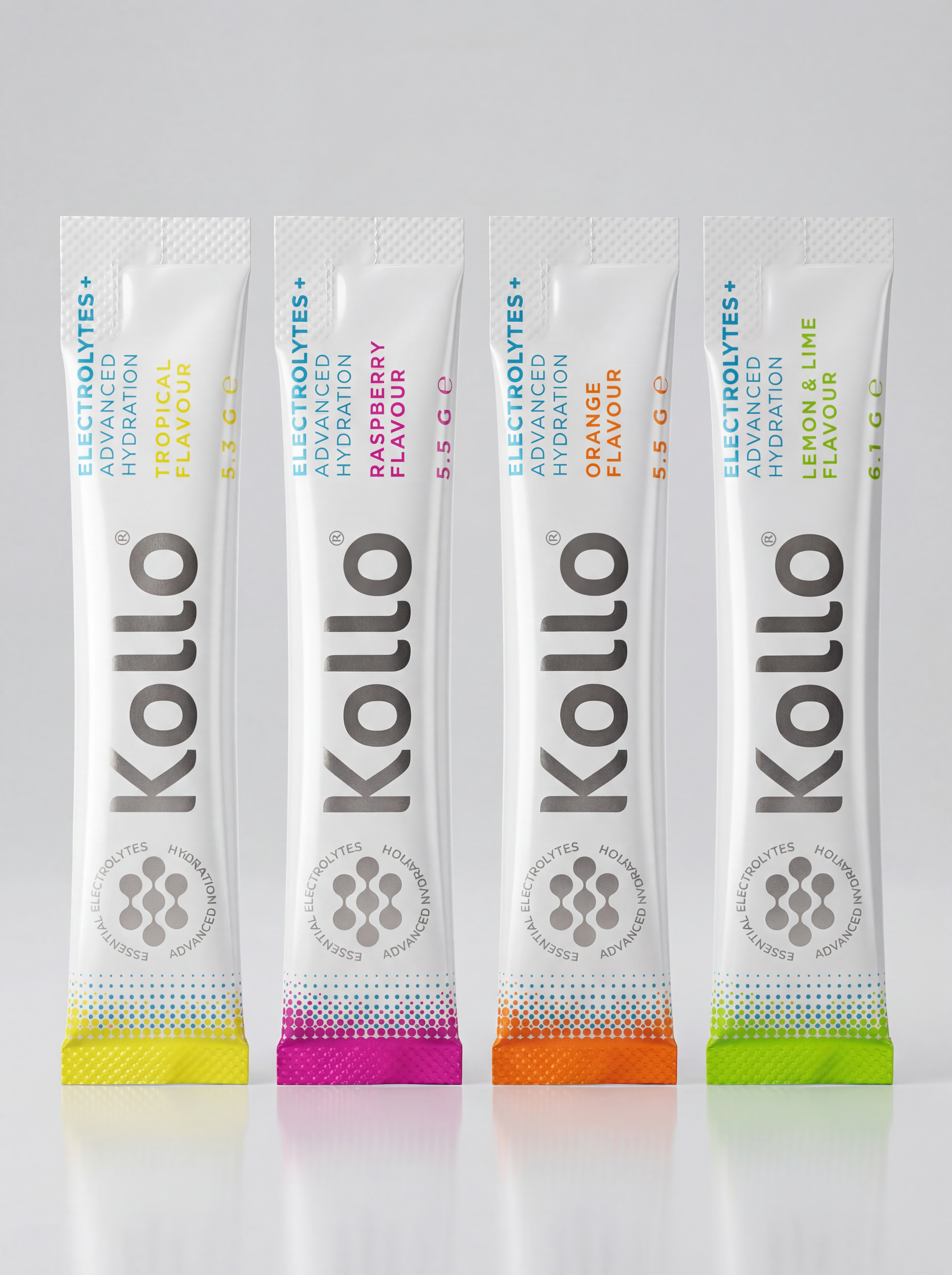 This bundle includes four boxes of Kollo® Electrolytes+ Advanced Hydration, giving you a two-month supply (56 sachets) across four refreshing flavours: Raspberry, Orange, Lemon & Lime, and Tropical.